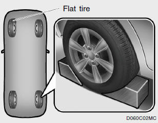 Block the wheel that is diagonally opposite from the flat to keep the vehicle from rolling when the car is raised on the jack.